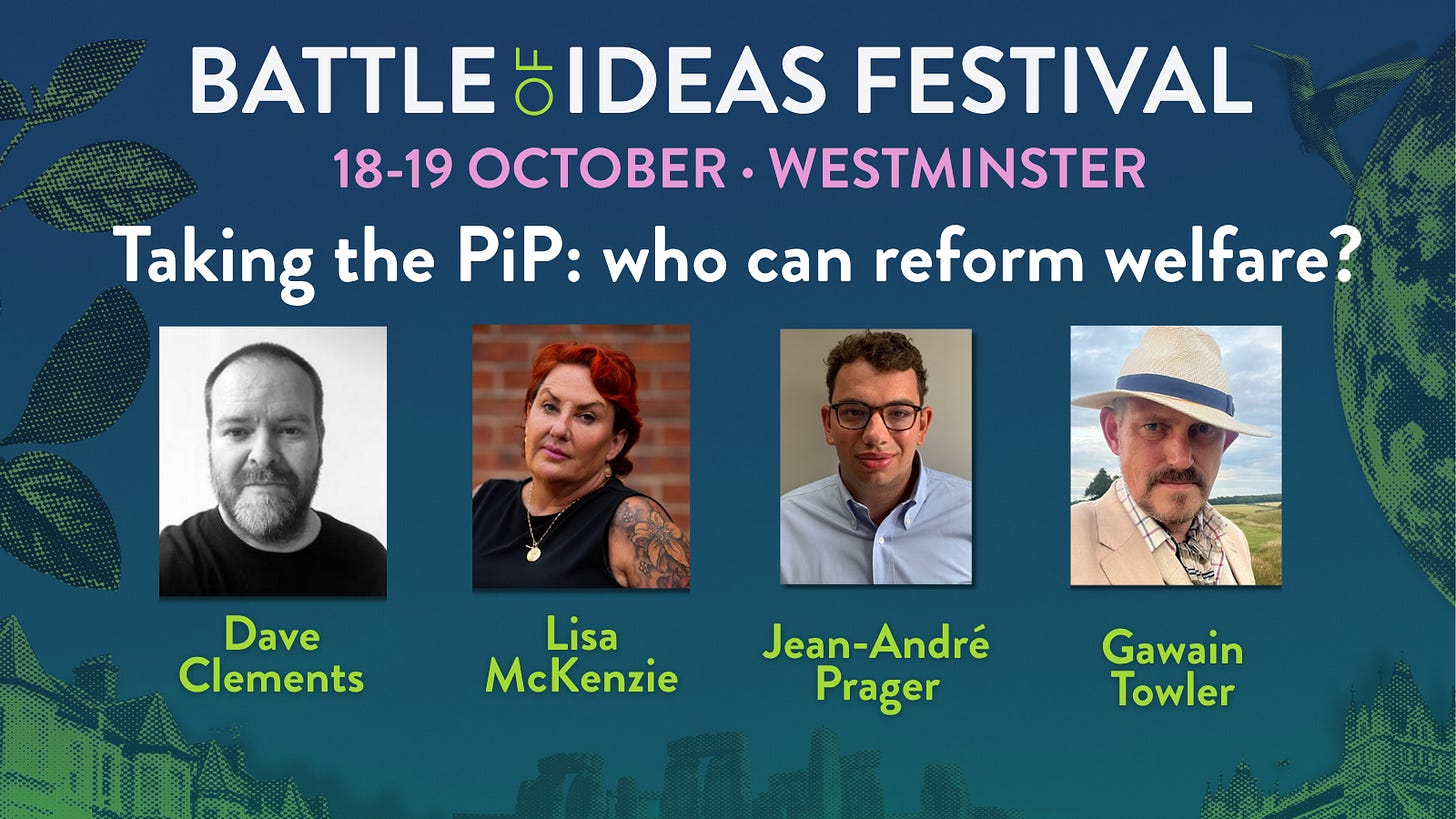 I’m delighted to have been invited to speak at the Battle of Ideas Festival next month, which is being held at Church House, Westminster. I’ll be speaking on a panel alongside Lisa McKenzie, working-class academic and author of Lockdown Diaries of the Working Class; Jean-André Prager, senior fellow at Policy Exchange; and [just added] Gawain Towler, former head of press at Reform UK.